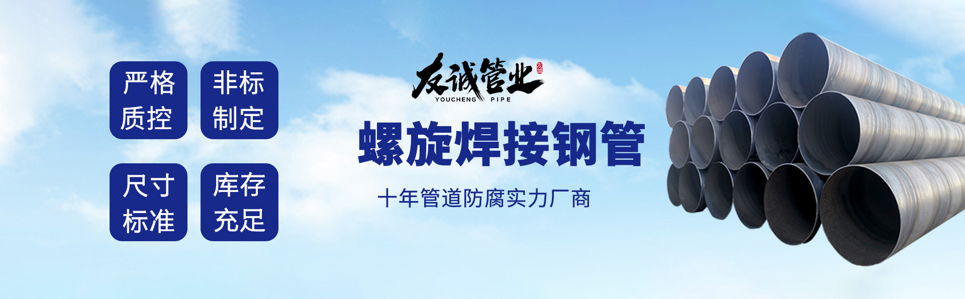 滄州友誠管業有限公司是一家專業從事生產防腐涂塑管道及管件于一體的大型企業。公司注冊資金8600萬元,位于中國管道生產基地—河北鹽山縣,近靠京滬高速、榮烏高速、黃石高速30公里,高鐵滄州西站40公里,天津國際機場、濟南遙墻機場150公里,為客戶來訪及業務發展提供了便利的交通條件。        鋼管系列:螺旋鋼管、無縫鋼管、ERW直縫焊管、JCOE埋弧焊直縫鋼管、熱鍍鋅鋼管。        涂塑系列:內外涂塑鋼管、涂塑復合鋼…… 了解更多
